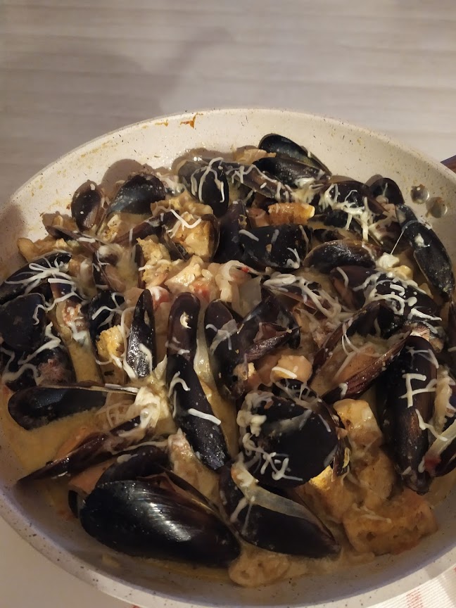 Coloquei o mexilhão dentro do refugado, deixei abrir.